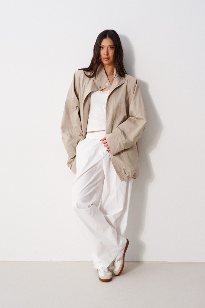 Топ прилегающего силуэта. Выполнен из мягкой трикотажной ткани тёплого белого цвета. Вырез горловины V-образный. По линии выреза горловины и по спинке кружево, переходящее в бретели. Длина спинки 35 см