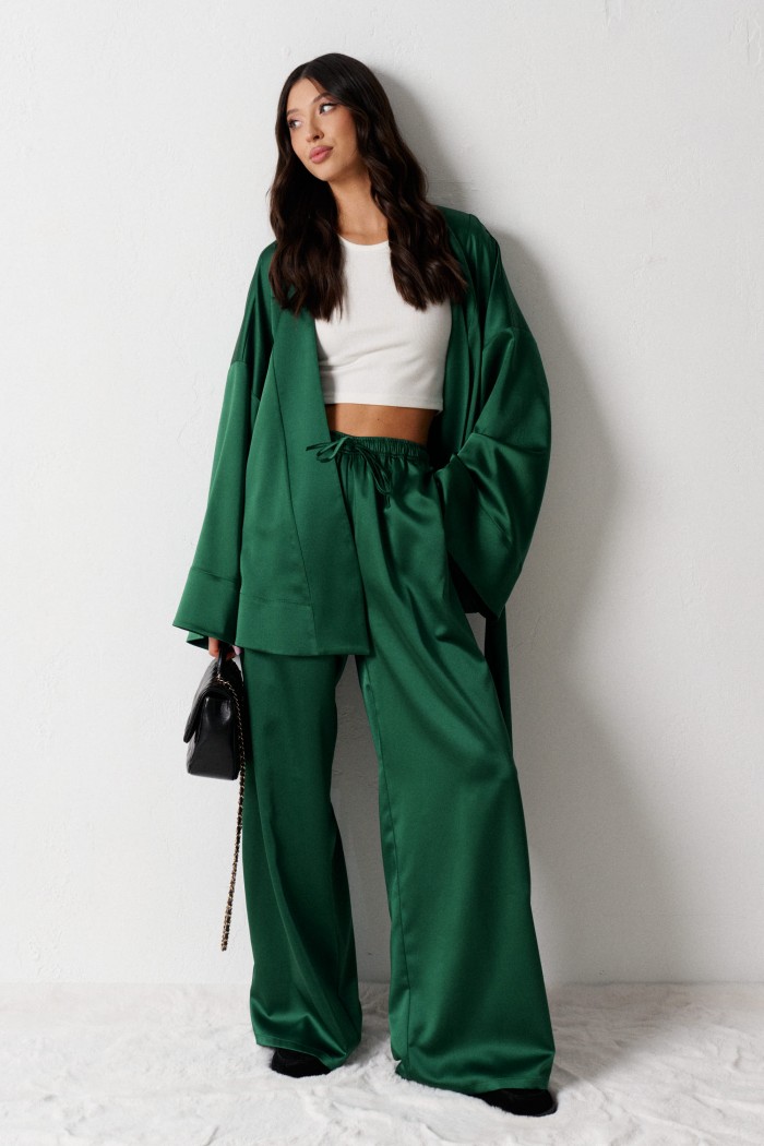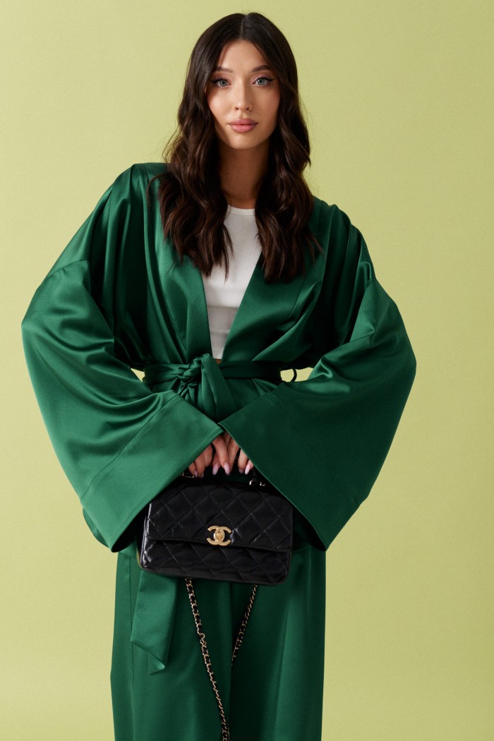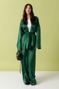 Кардиган прямого кроя выполнен из ткани изумрудного цвета.