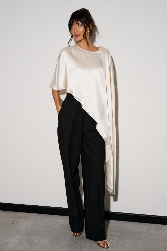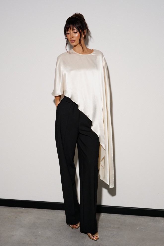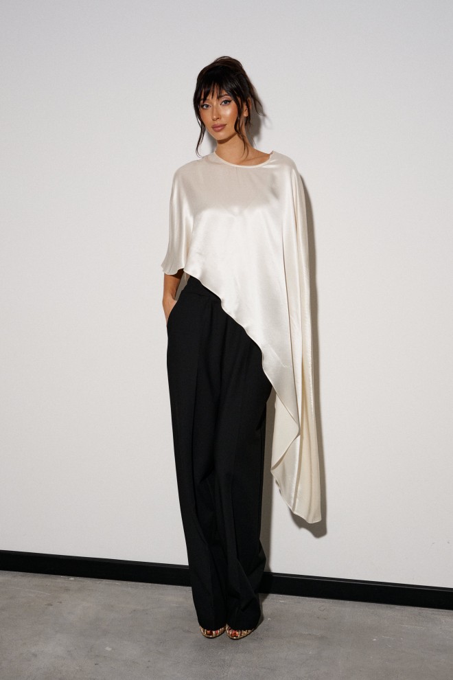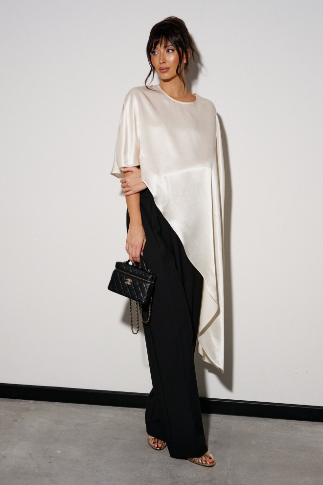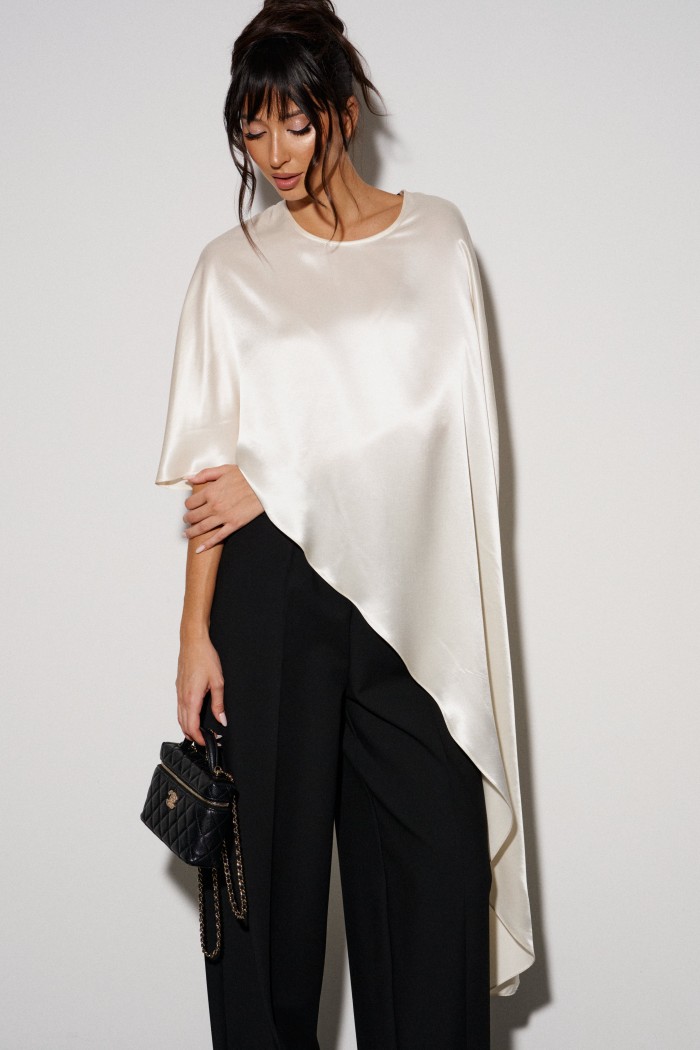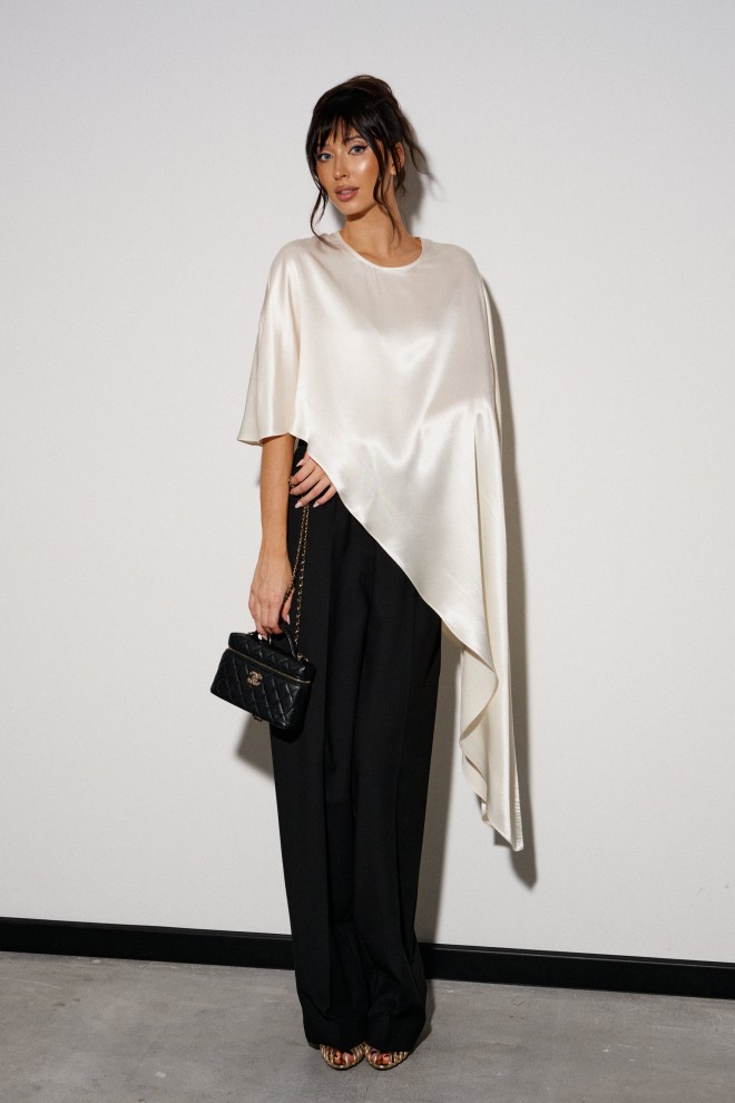 Кейп выполнен легкой, струящейся ткани цвета айвори. Характеристики: свободный, асимметричный крой, на спинке застежка-пуговичка. Длина изделия по боковому шву 122 см