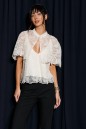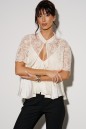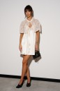 Кейп выполнен из кружевного сатинового полотна молочного цвета. Характеристики: горловина стойка, застежка центральная на пуговицу. Длина по спинке 36см.