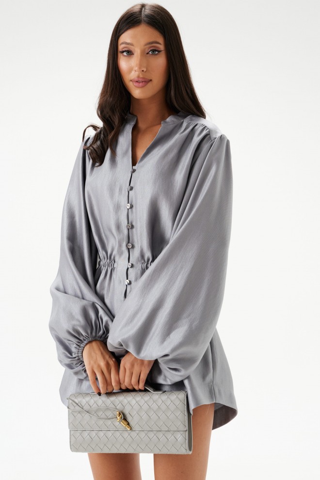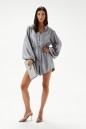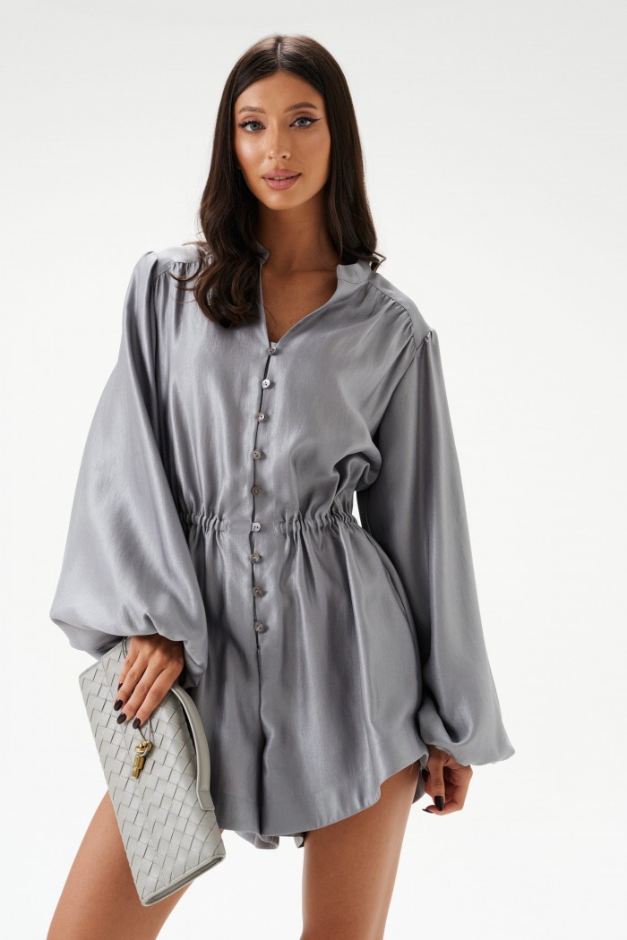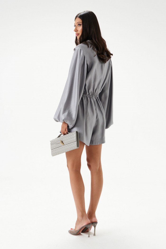 Комбинезон приталенного силуэта. Выполнен из полотна небесно-перламутрового цвета с блеском. Застежка на петли и пуговицы. Воротник стойка, V-образный вырез. Рукав втачной, с резинкой внизу. Шорты комбинезона прямые, свободные, в боковых швах потайные карманы. По линии талии кулиса на резинке. Длина спинки 84 см. Длина рукава от края горловины 77 см