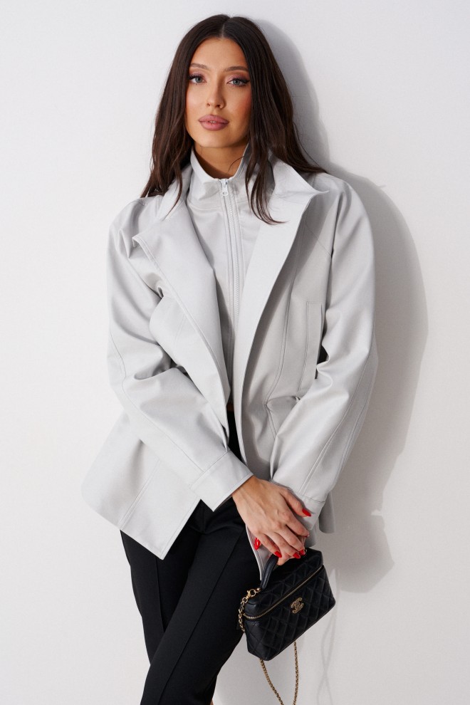 Куртка свободного кроя выполнена из эко-кожи серого цвета. Характеристики: подкладка, воротник-стойка, рукав реглан с манжетом, внутренняя часть изделия - манишка с центральной застёжкой - молнией, основная часть изделия с прорезными карманами с листочкой, по линии талии - резинка, с кулиской, с фиксаторами. Длина рукава от горловины 79 см. Длина спинки 73 см.