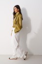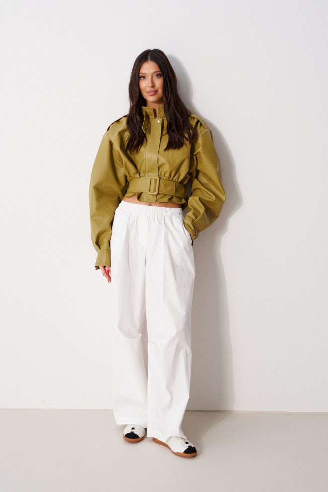 Куртка с акцентыми деталями, выполнен из эко-кожи ярко-зеленого цвета. Характеристика: укороченный крой, воротник-стойка с застежкой-ремешком на кнопке, центральная застежка-замок, скрытая под планкой на кнопку сверху, плечевые швы сшиты сборкой и гармонично сочетаются с патами на кнопке, плечики, брендированный подклад, планка по низу изделия спереди, спинка отрезная, по спинке талия на резинке с кокеткой по низу, пояс в комплекте, рукав втачной слегка спущен, широкий манжет на одну кнопку. Длина рукава от края горловины 81см. Длина изделия по центру спинки 53см.