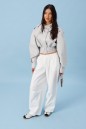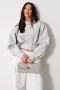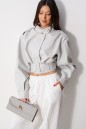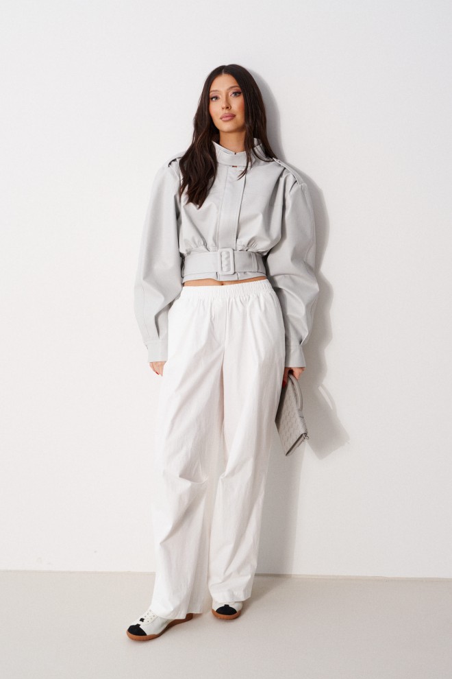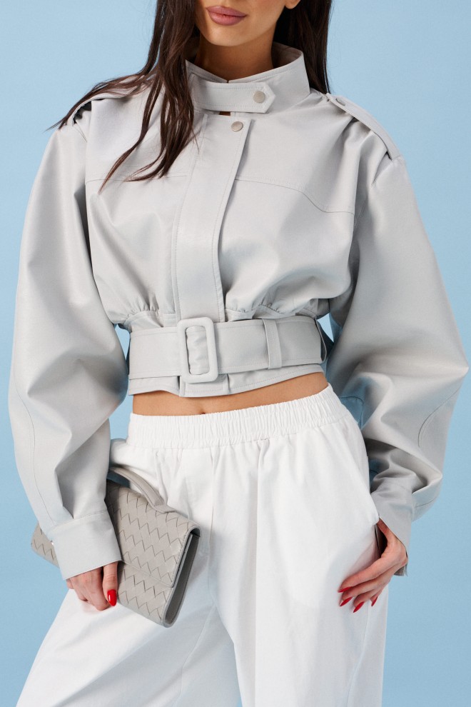 Куртка с акцентыми деталями, выполнен из эко-кожи серого цвета. Характеристика: укороченный крой, воротник-стойка с застежкой-ремешком на кнопке, центральная застежка-замок, скрытая под планкой на кнопку сверху, плечевые швы сшиты сборкой и гармонично сочетаются с патами на кнопке, плечики, брендированный подклад, планка по низу изделия спереди, спинка отрезная, по спинке талия на резинке с кокеткой по низу, пояс в комплекте, рукав втачной слегка спущен, широкий манжет на одну кнопку. Длина рукава от края горловины 81см. Длина изделия по центру спинки 53см.