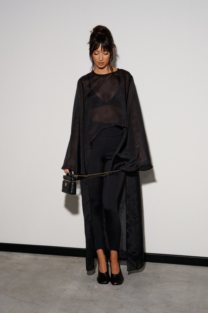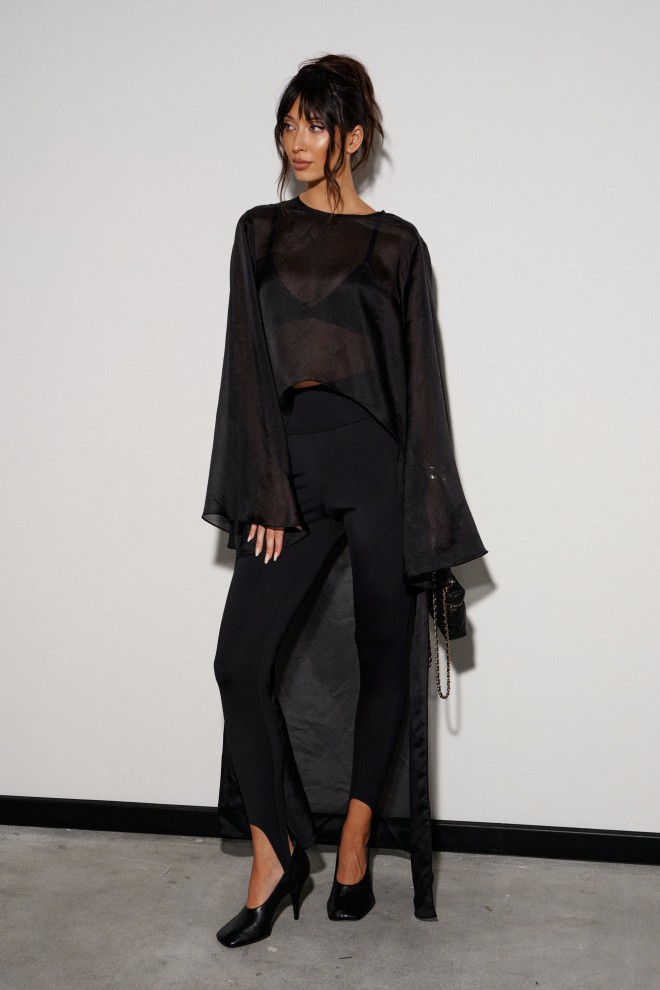 Леггинсы со штрипками выполнены из плотной эластичной ткани чёрного цвета. Характеристики: отрезной широкий пояс из основной ткани, штрипки снизу на резинке. Длина 102см