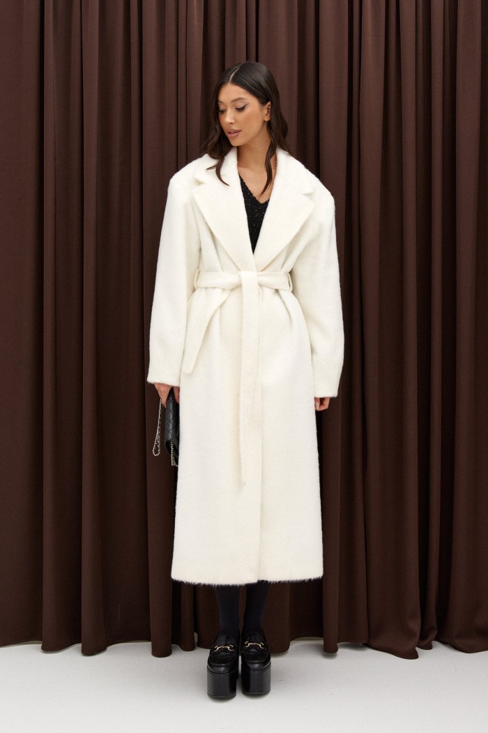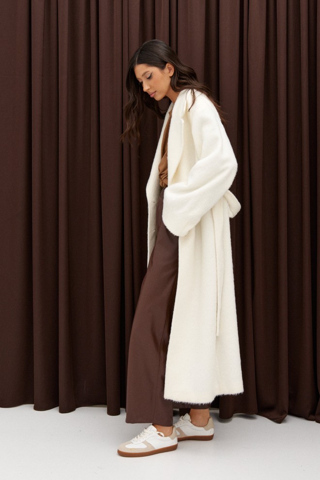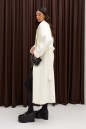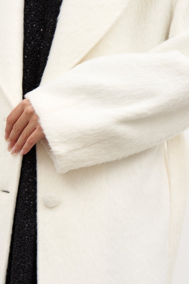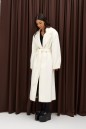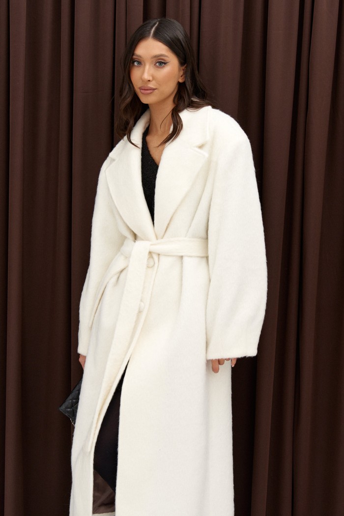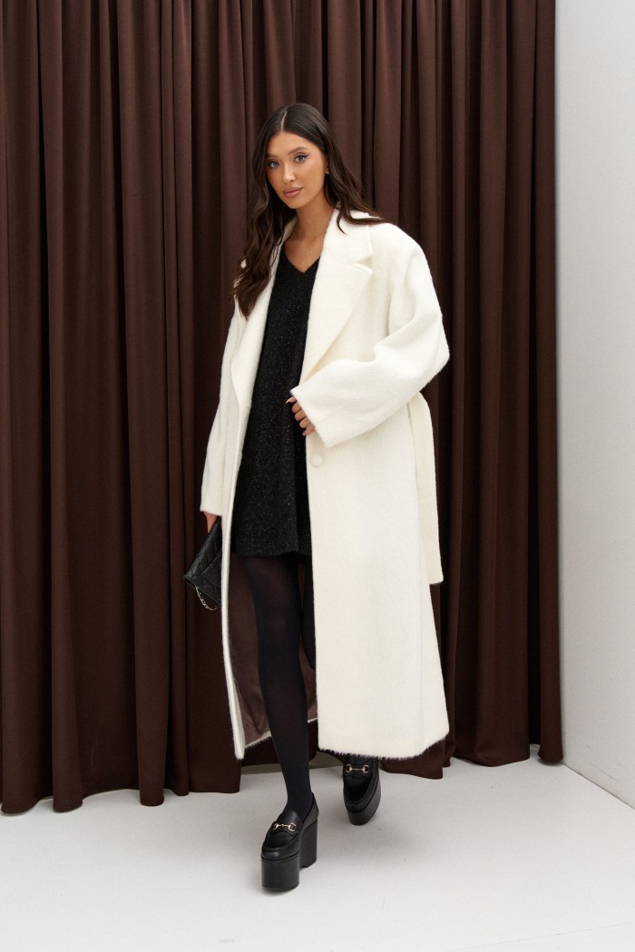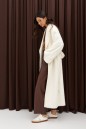 Полупальто прямого кроя выполнено из фактурного полотна молочного цвета. Характеристики: есть подклад, рукав втачной, воротник пиджачного типа, в боковых швах карманы. Спинка со средним швом заканчивается шлицей, застёжка центральная на петли и пуговицы, пояс выполнен из основной ткани изделия.