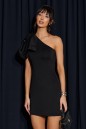 Платье-мини приталенного силуэта. Выполнено из мягкого плотного трикотажа чёрного цвета. Декорировано бантом из хлопка чёрного цвета (съёмный на булавке). Одно плечо открыто. Застёжки в изделии нет. Длина от плеча 85 см, длина по боковому шву 64 см
