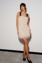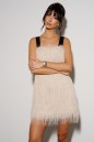 Платье-мини, крямого кроя. Выполнено из полотна с длинным ворсом, кремового цвета с мелкими блестками. Широкие бретели, есть подкладка. Длина спинки 57 см.