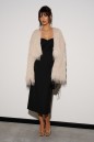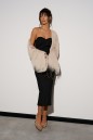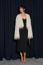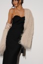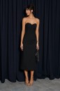 Платье-миди, выполнено из черного текстильного полотна. Характеристики: прилегающий силуэт, верх фигурный, имитация корсета,в среднем шве заднего полотна застёжка - потайная тесьма-молния, подкладка, по задней части шлица 45 см. Длина спинки 99 см