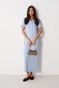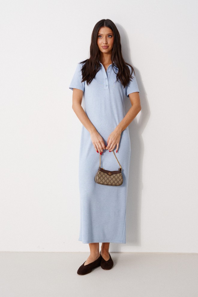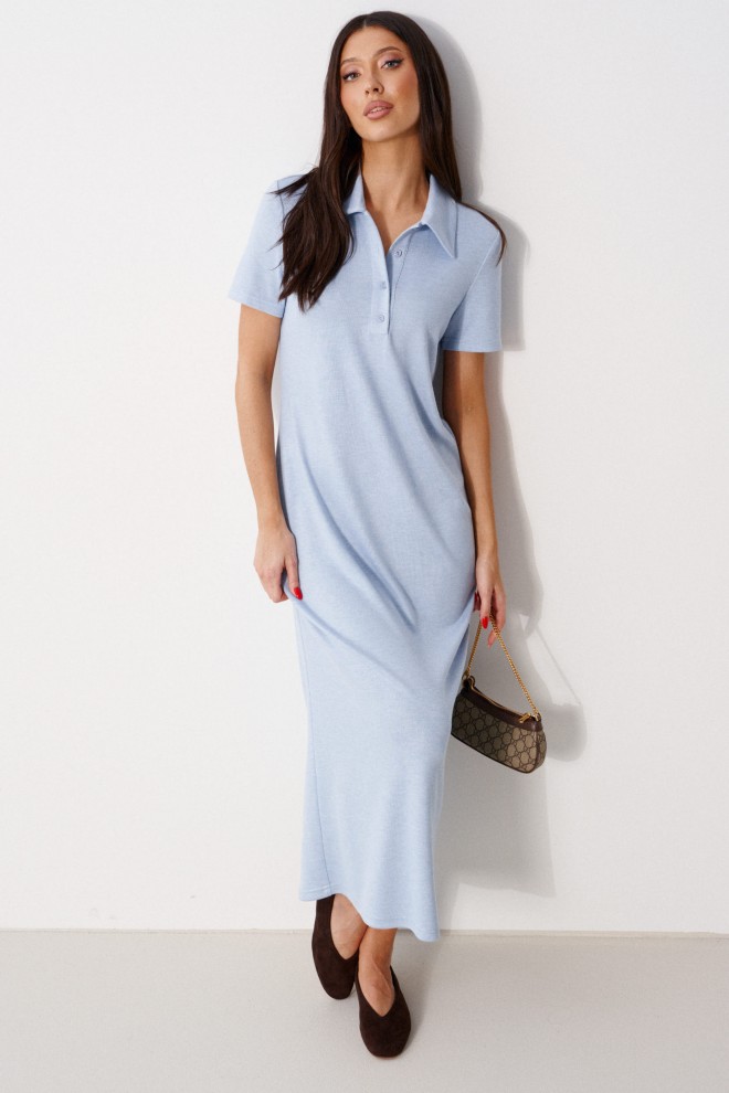Платье-макси выполнено из трикотажного полотна голубого цвета. Характеристика: прямой крой, отложной воротник-поло,застёжка – пуговички,рукав втачной. Длина рукава от линии втачивания 21 см. Длина спинки 134 см