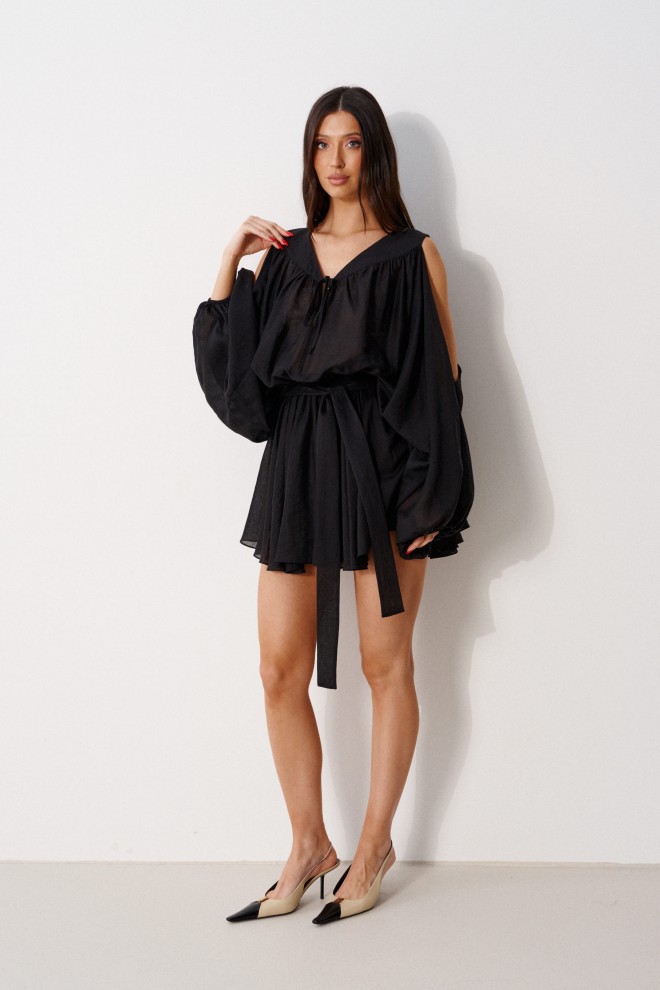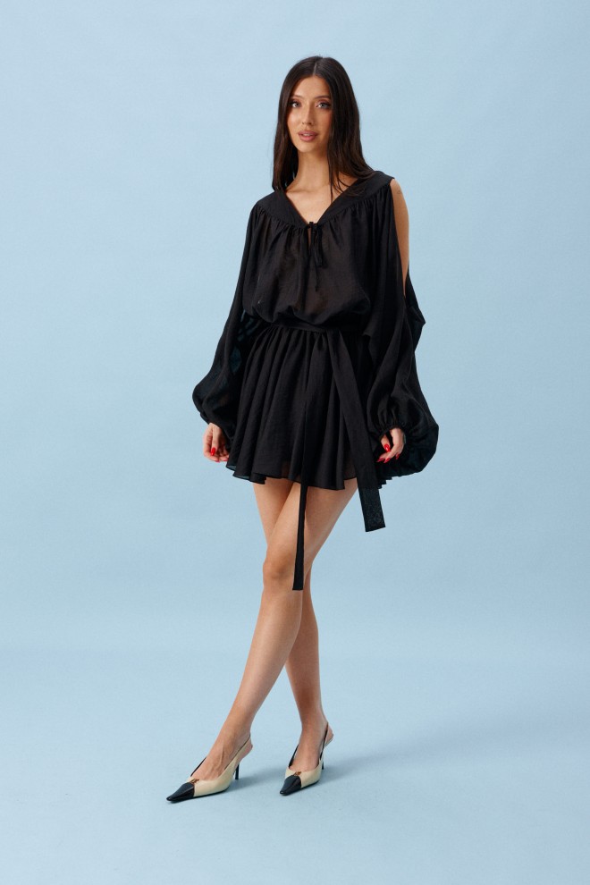 Платье-мини выполнено из текстильного полотна черного цвета. Характеристика: подьюбник, на талии резинка, v-образный вырез, рукава Элетучая мышь", вырезы по верху рукава, на поясе. Длина изделия по спинке 88 см.