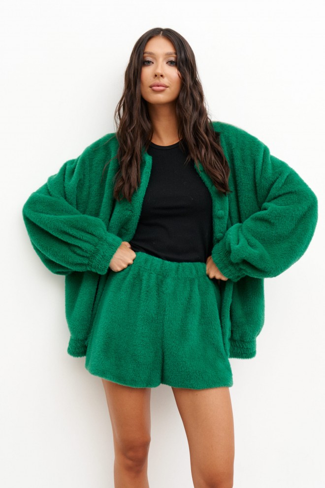 Шорты прямого кроя выполнены из текстурного мягкого полотна зеленого цвета. Характеристики: прямой крой, подкладка, пояс на резинке. Длина по боковому шву 38 см.