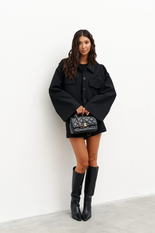 Шорты прямого свободного кроя выполнены из полотна черного цвета. Шорты прекрасно дополнят Ваши повседневные образы. Характеристики: прямой свободный крой, стабильный пояс, по поясу нашиты шлевки, застежка молния, пуговичка. По переду накладные функциональные карманы с пуговичкой. Пуговички в изделии декоративные, по заднему полотну шорт карманов нет. Длина по боковому шву 40 см.
