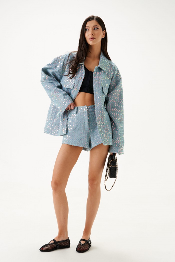 Шорты. Выполнены из джинсовой ткани голубого цвета на люрексной основе с перфорацией и пайетками. Пояс стабильный. Шлёвки. Застёжка центральная пуговицы, молния. По переду фигурные карманы. Задняя часть с кокеткой и накладными карманами.