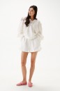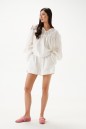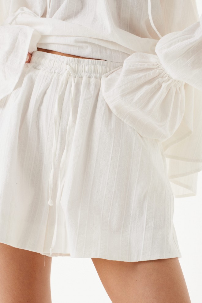 Шорты свободного кроя, из хлопковой ткани белого цвета. Пояс на резинке с завязками, подкладка, в боковых швах корманы. Длина по боковому шву 39см.