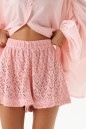 Шорты прямого кроя. Выполнены из трикотажного фактурного полотна фигурной вязки. Пояс на резинке. Длина 36 см