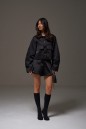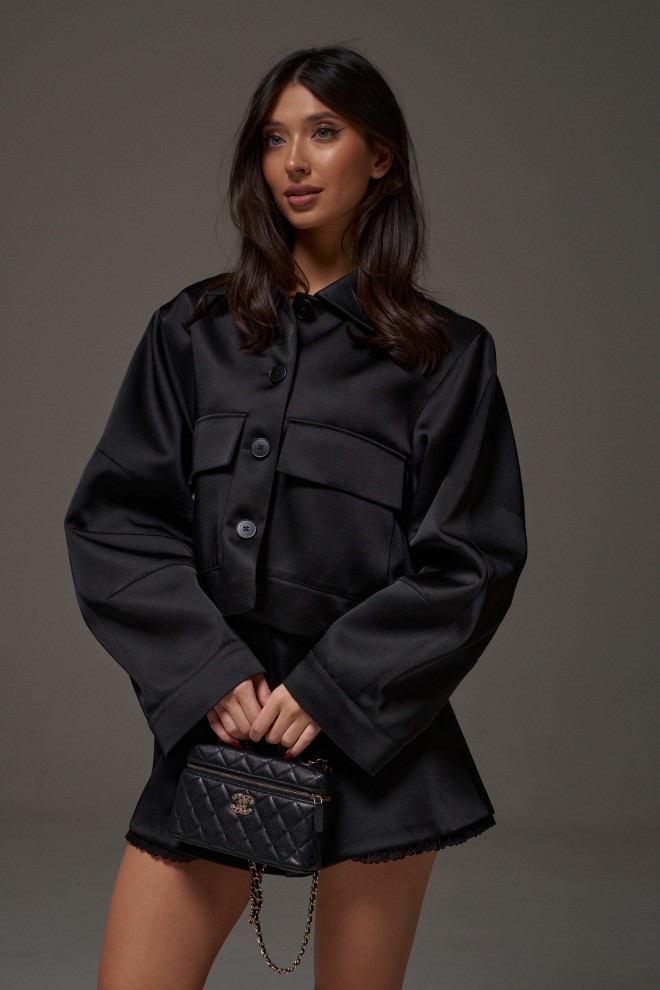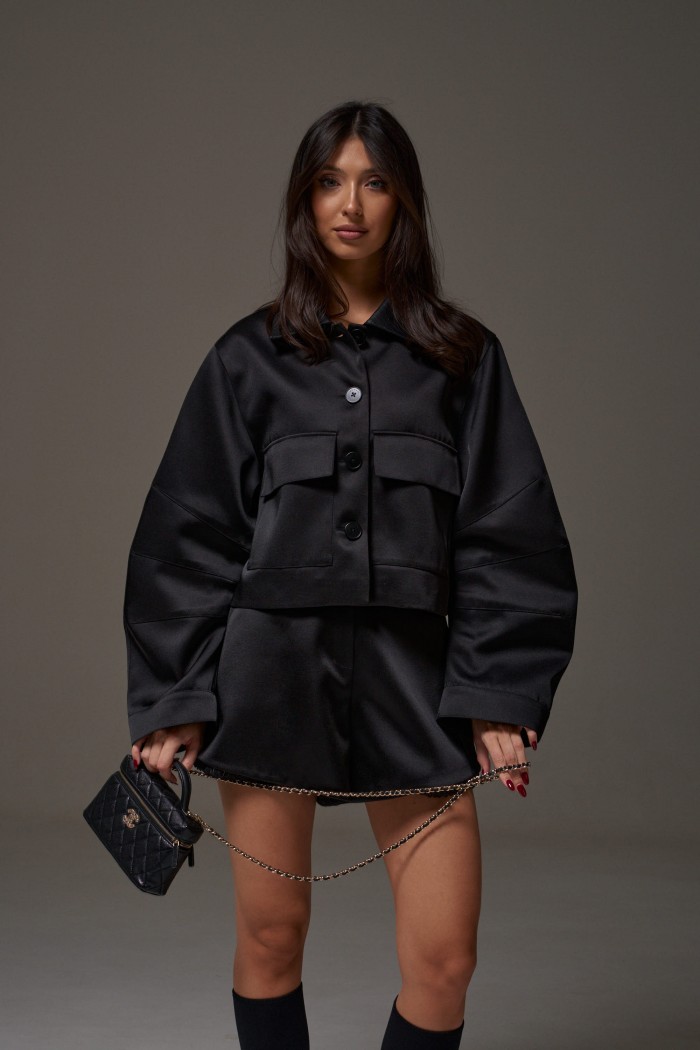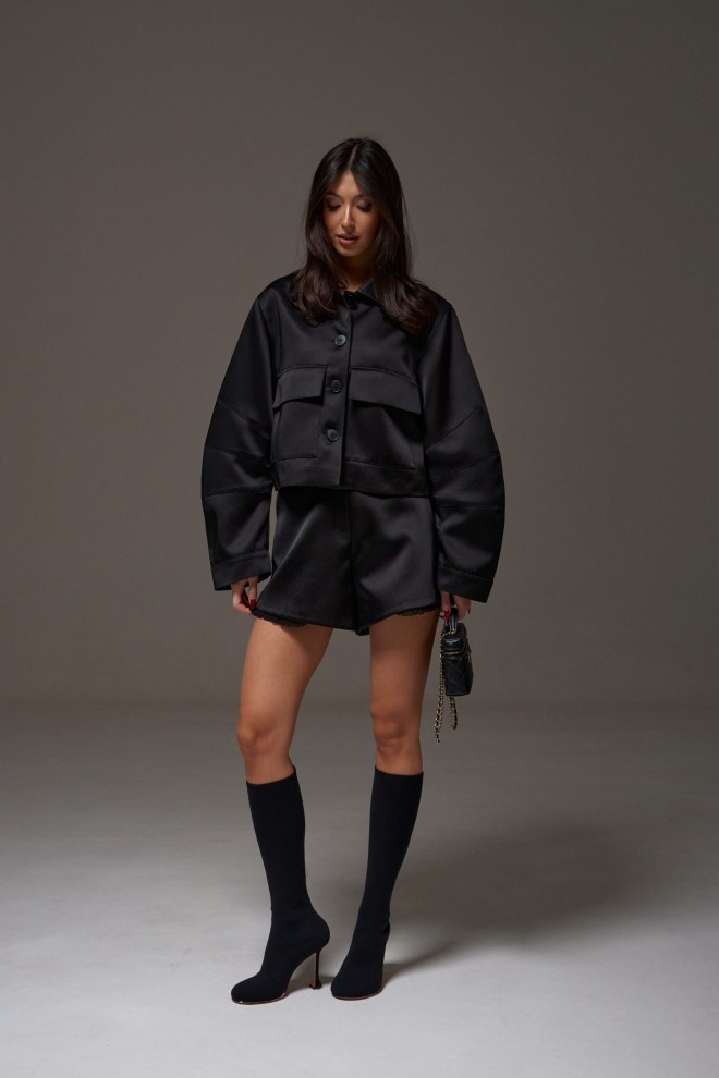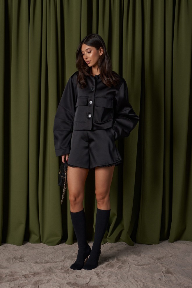 Шорты свободного кроя выполнены из костюмной ткнаи черного цвета с блеском. Характеристика: стабильный пояс, засежка молния и петля-пуговица, по низу изделия нашито декоративное кружево черного цвета, в боковых швах карманы, брендированная подкладка. Длина по боковому шву 39 см.