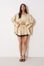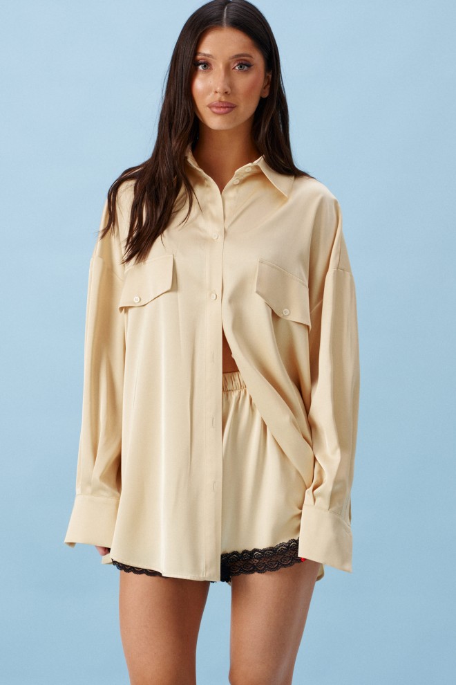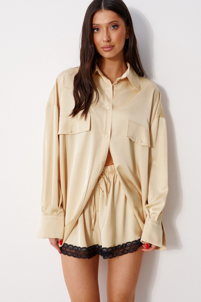 Шорты свободного кроя, выполнены из струящейся ткани. Характеристики: свободный крой, пояс на резинке с кулиской, иммитация гульфика, по низу шорты украшены ажурным кружевом. Длина по боковому шву 37 см.