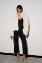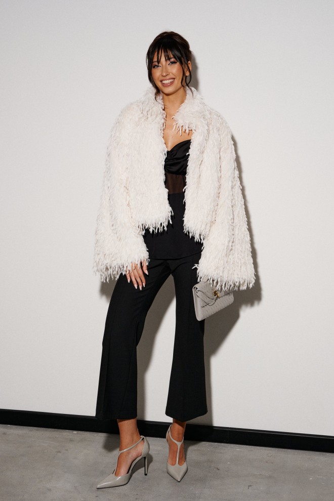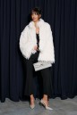 Шубка свободного кроя. Выполнена из мягкой пушистой ткани "пёрышки" тёплого белого цвета. Со стёганной подкладкой. Воротник стойка. Рукав втачной, спущенный. Застёжка центральная - крючки (3 шт). Длина рукава от линии втачивания 53 см. Длина спинки 50 см