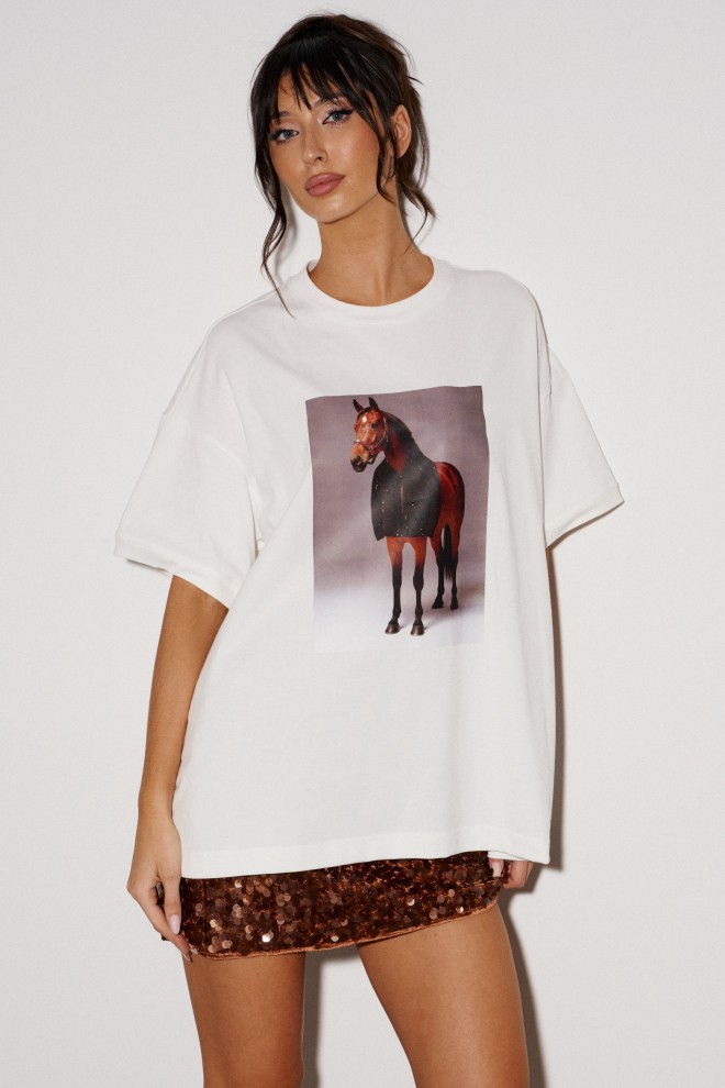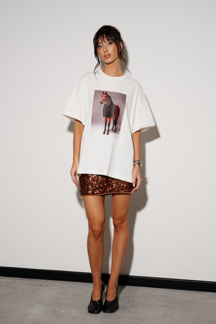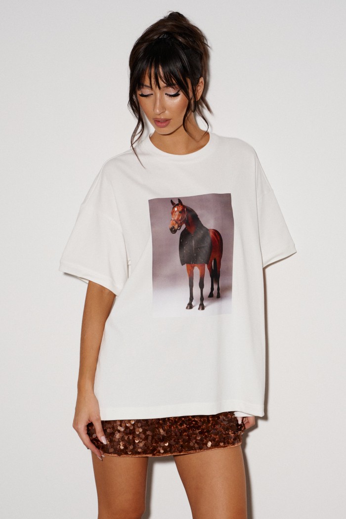 Футболка прямого свободного кроя, выполнена из трикотажного полотна молочного цвета. Характеристика: прямой крой, овальная горловина. Рукав спущен. Спинка цельнокраеная, по переду напечатан принт. Длина спинки 68см, длина рукава от края горловины 41см.