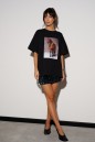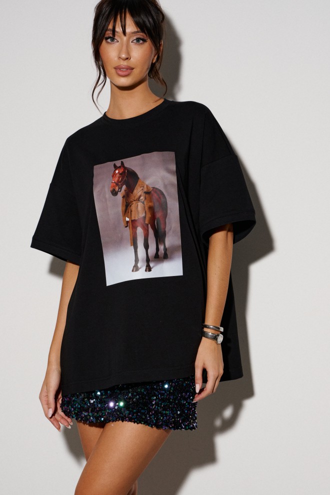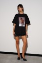 Футболка прямого свободного кроя, выполнена из трикотажного полотна черного цвета. Характеристика: прямой крой, овальная горловина. Рукав спущен. Спинка цельнокраеная, по переду напечатан принт. Длина спинки 68см, длина рукава от края горловины 41см.