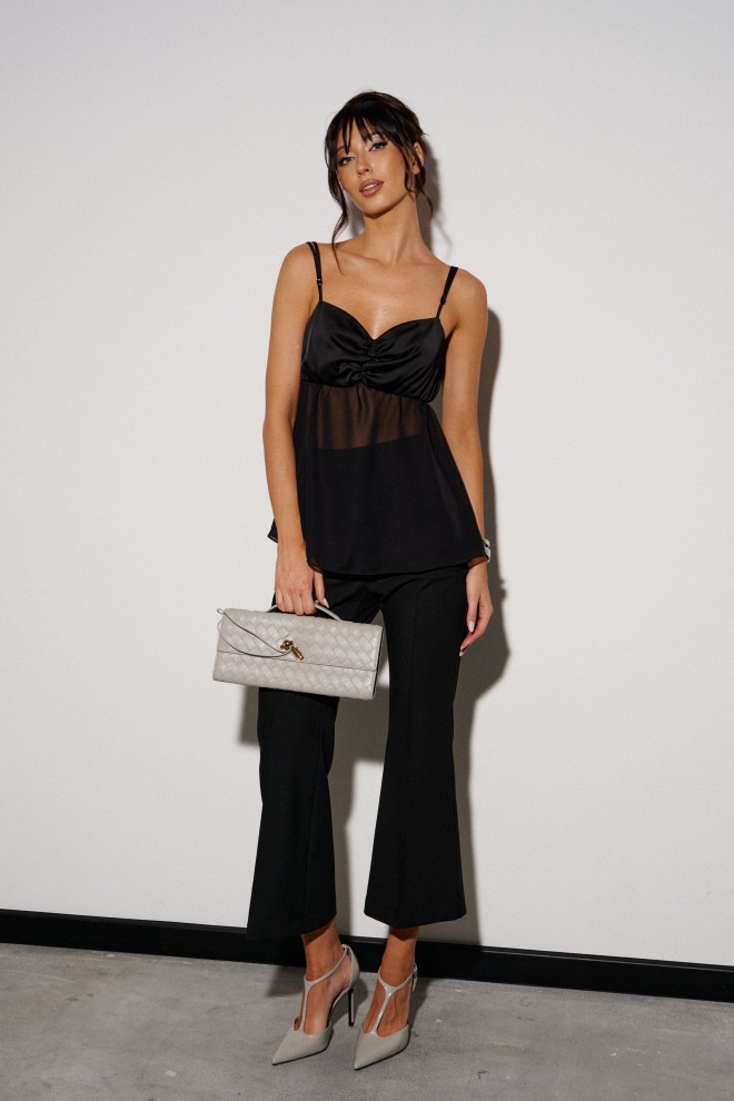 Топ женский, в стиле Ампир. Верх выполнен из атласной ткани, нижня баска из шифона. Регулируемые брители. По верхней части лифа по центру сборка. Длина по спинке