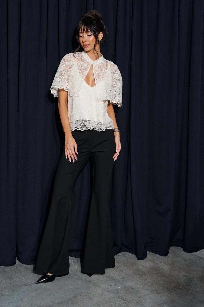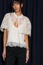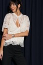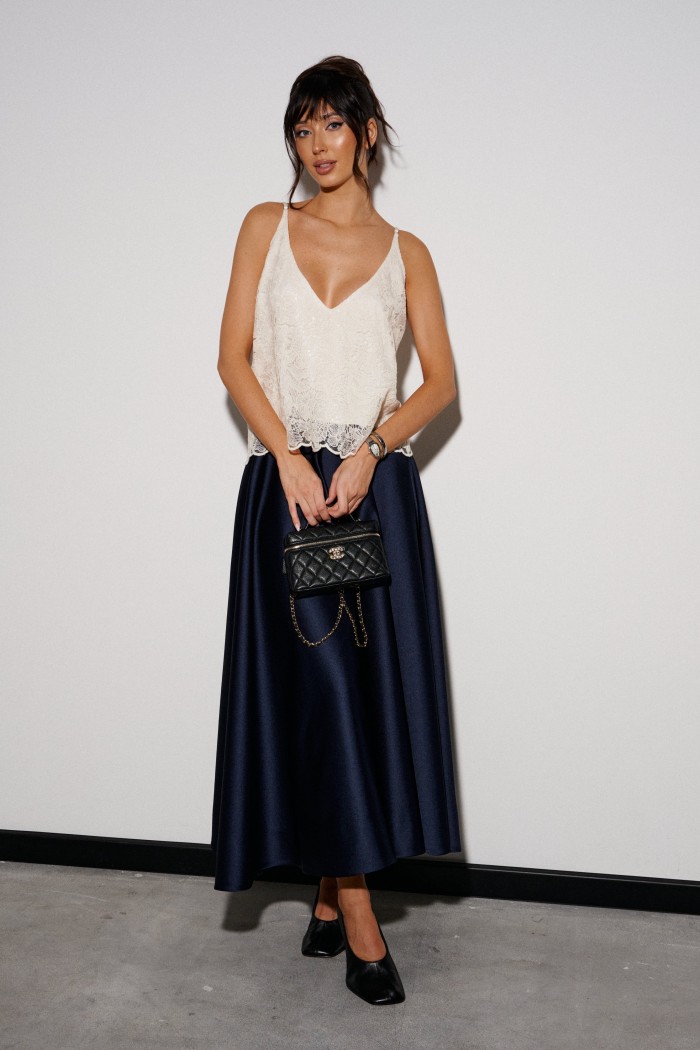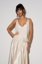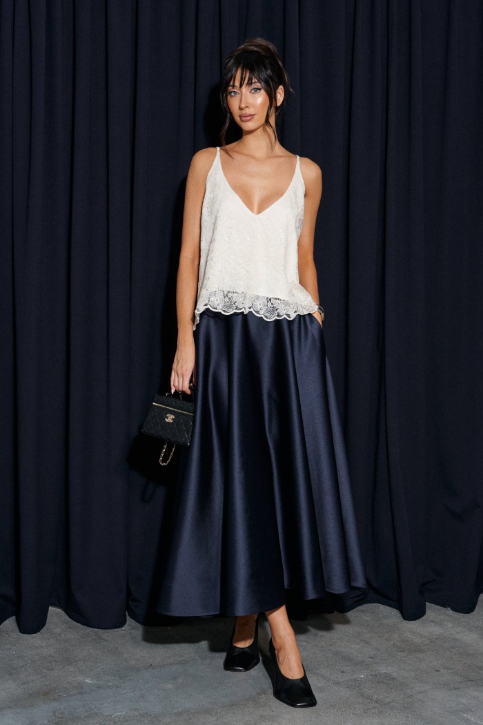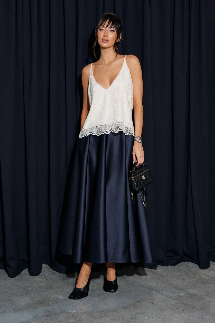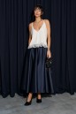 Топ прямого свободного прямого кроя, выполнен из кружевного сатинового полотна молочного цвета. Характеристика: прямой крой, v-образный вырез горловины. Подкладка, тонкие бретели с регулировкой. Длина по спинке 40 см.