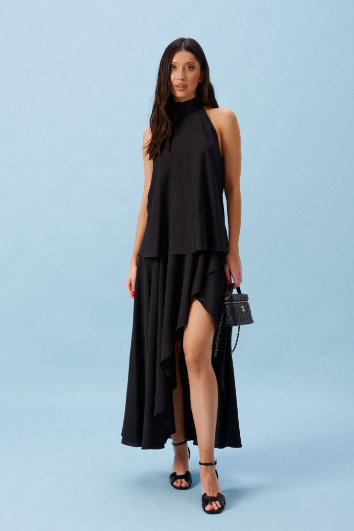 Блуза А-силуэта. Выполнена из лёгкого струящегося полотна черного цвета. Горловина – стойка-лента, формирующая бант сзади. По спинке верхняя часть с вырезом-качелью. Длина по боковому шву 39 см