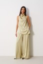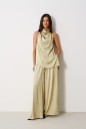 Блузон свободного ассиметричного кроя. Выполнен из струящейся ткани сетлого оливкого цвета. Горловина-качель, застегивается сзади на петли пуговицы. Верхняя часть спинки на резинке. Топ без рукавов. По длинному боковому шву снизу разрез (20 см). Длина по короткому боковому шву 40 см, длина по длинному боковому шву 53 см.