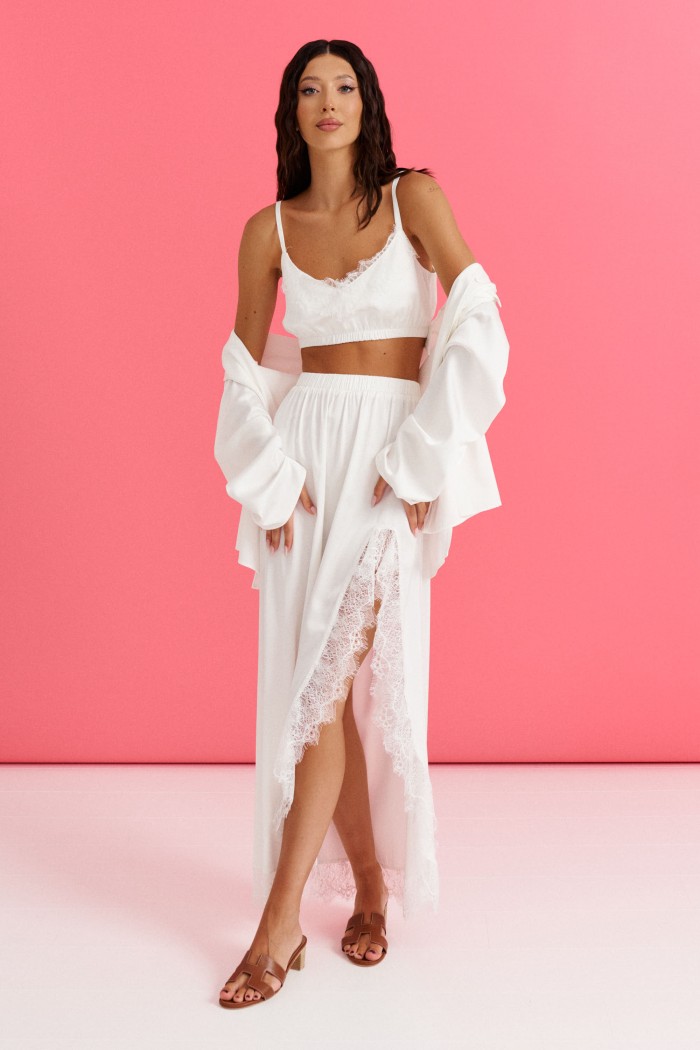 Характеристики: укороченный топ, регулируемые бретели, фигурный вырез горловины, по горловине ажурное кружево, низ изделия на резинке. Длина по спинке 19 см.