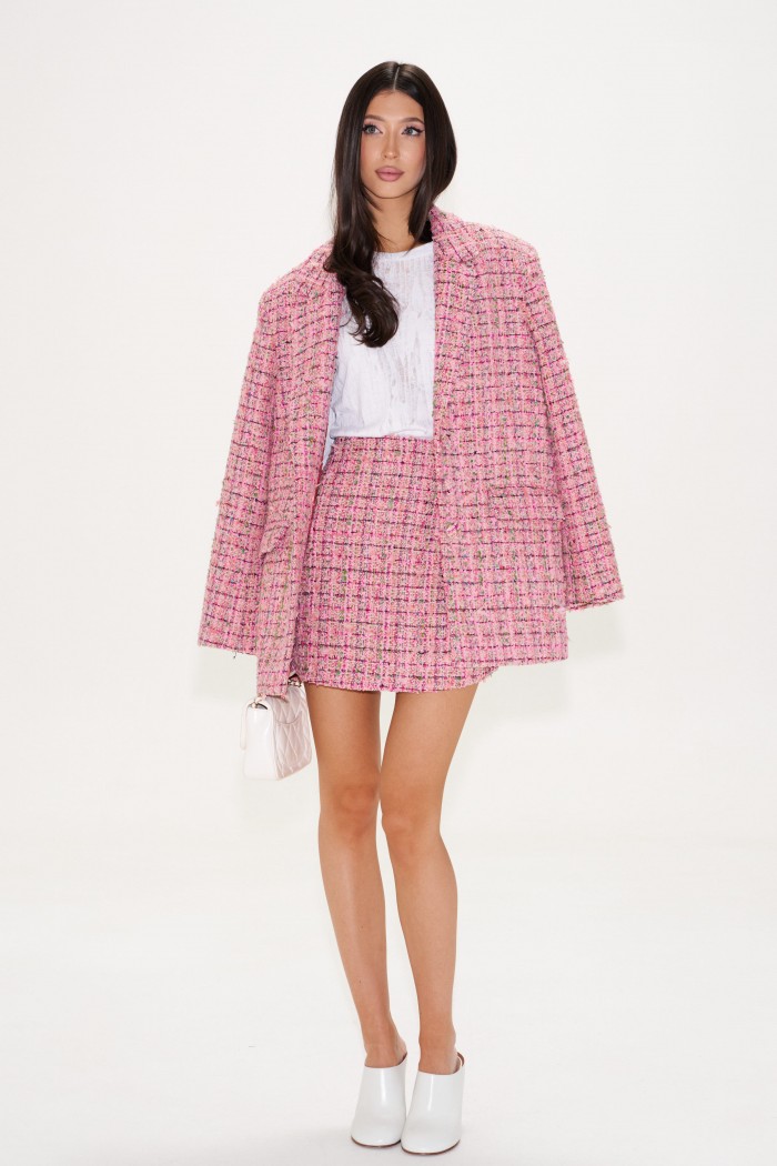 Юбка-мини. Выполнена из твида с пайетками. А-образный силуэт (трапеция). Пояс стабильный, линия талии на обтачке. Есть подклад. Застежка потайная тесьма молния в среднем шве заднего полотна. Длина по боковому шву 44 см