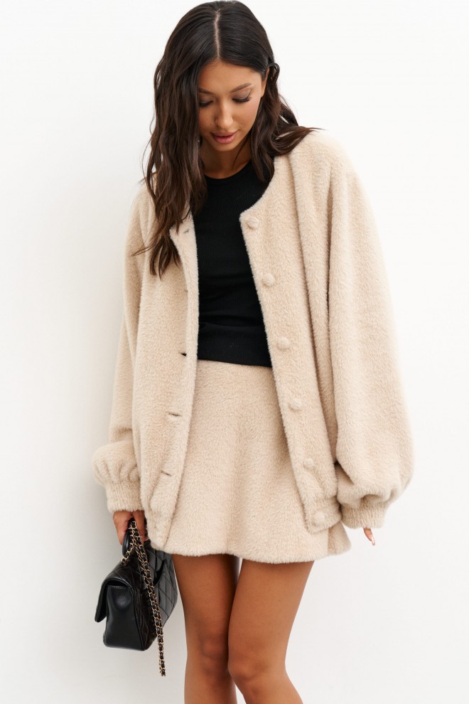 Юбка прямого кроя выполнена из мягкого фактурного полотна бежевого цвета. Характеристики: прямой крой, подкладка, пояс на резинке. Длина изделия 42 см.