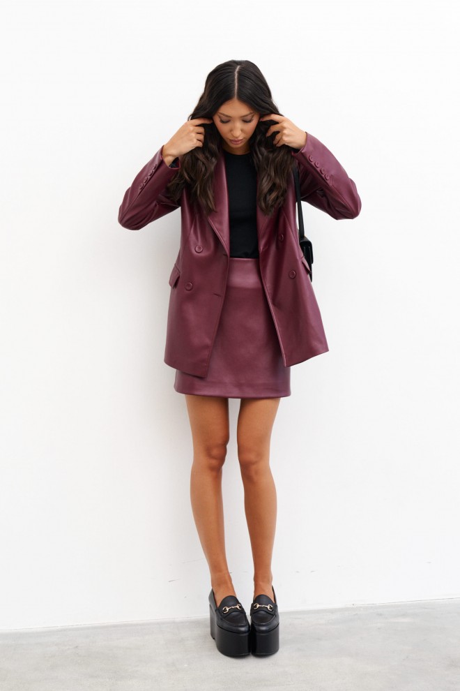 Юбка полуприлегающего силуэта выполнена из экокожы цвета бордо. Характеристики: А-образный силуэт, подкладка, застежка - потайная тесьма молния в среднем шве заднего полотна изделия. Длина 42 см.