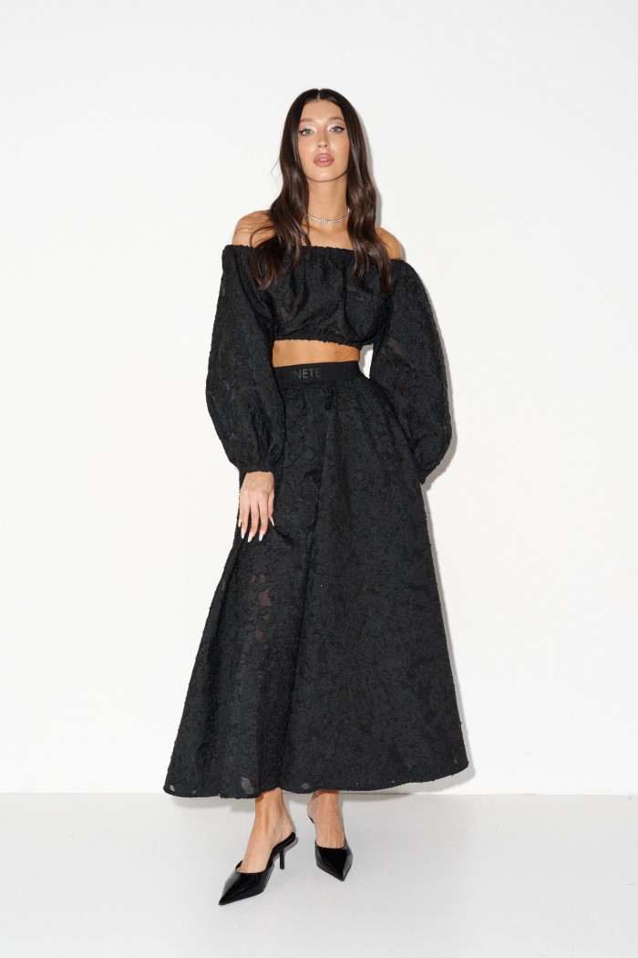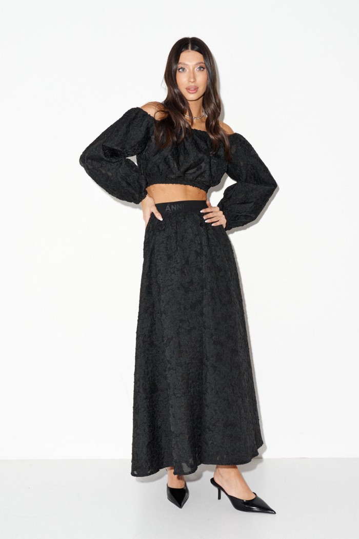 Юбка женская выполнена из черного полупрозрачного фактурного полотна с эластичным поясом. Характеристики: подкладка в длине мини, крой "солнце", пояс притачная резинка, по поясу нанесен логотип бренда - ANNETE. Длина изделия 96см.