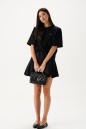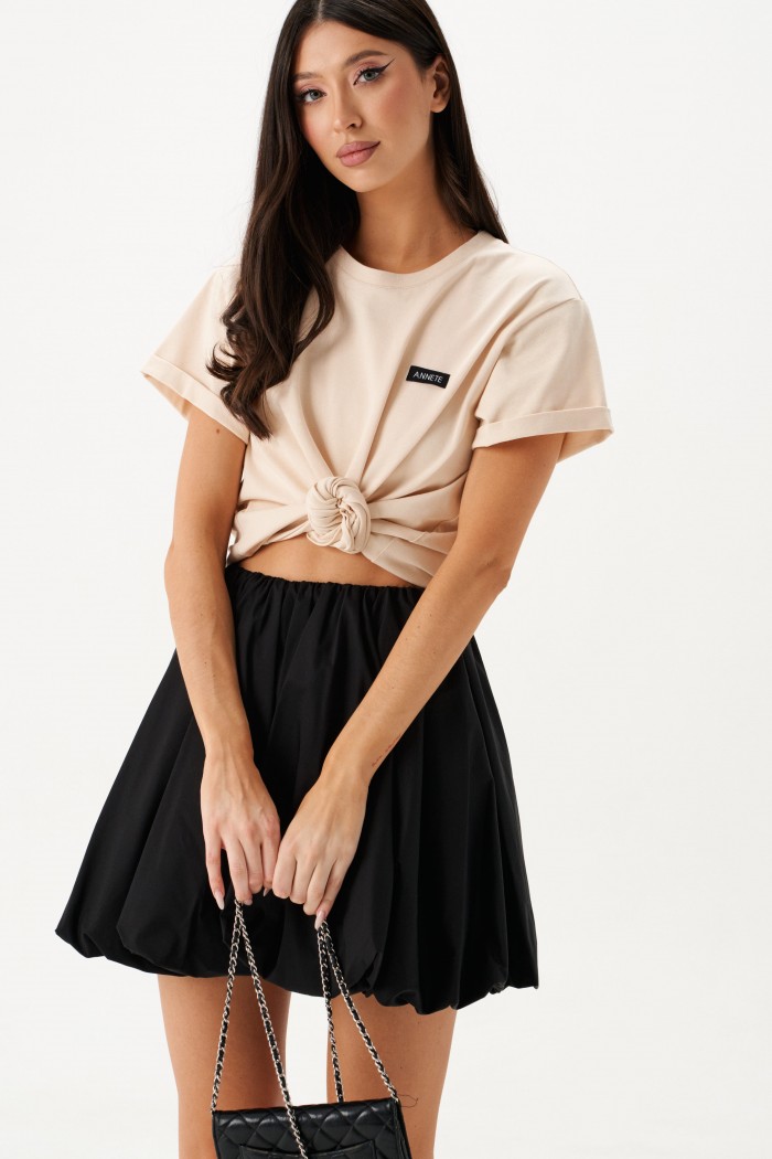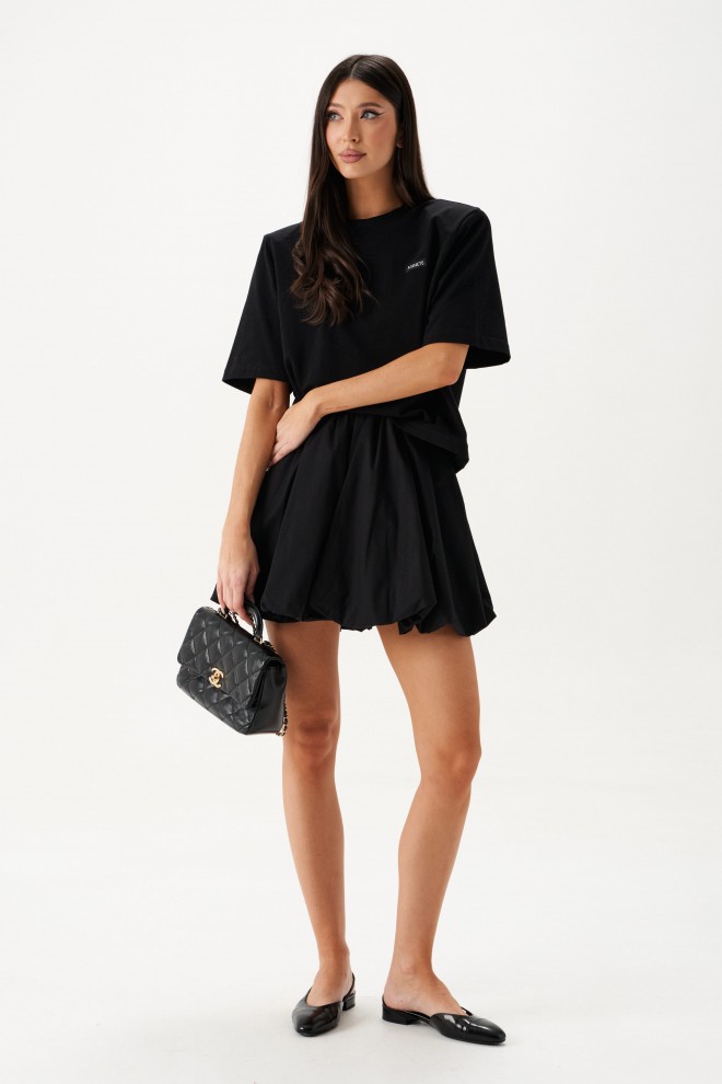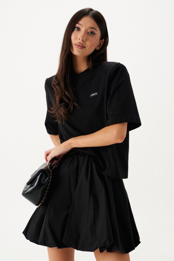 Юбка-баллон в длине мини. Выполнена из хлопкового полотна чёрного цвета. Пояс на резинке со сборкой. Есть подкладка. Застёжки нет. Длина 41 см