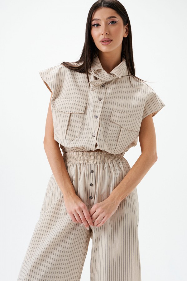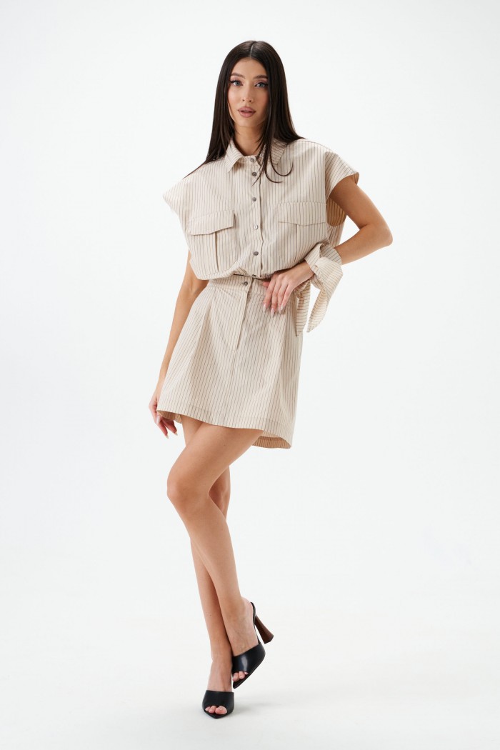Юбка А-силуэта. Выполнена из хлопкового полотна. Пояс стабильный. Застёжка центральная пуговка и потайная молния. По переду складки. В боковых швах наклонные карманы. Задняя часть изделия с выточками. Длина 42 см