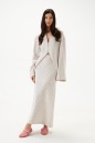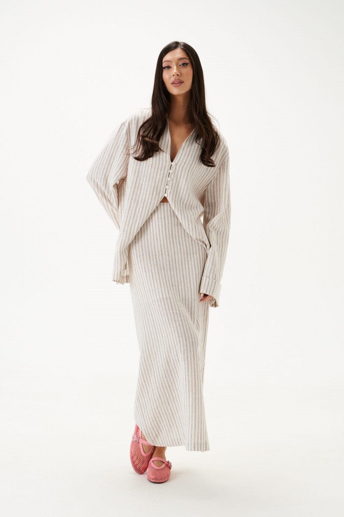 Юбка-макси. Выполнена из льняного (смесового) полотна. Прямой крой. Пояс на обтачке, стабильный. В среднем шве заднего полотна шлица 58 см. Застёжка в среднем шве заднего полотна молния. Длина юбки 95 см