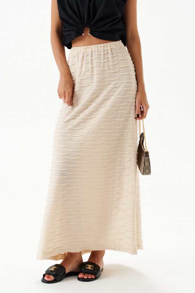 Юбка свободного кроя (трапеция). Выполнена из фактурного трикотажного полотна бежевого цвета. Без подкладки. Пояс на резинке. Длина юбки 97 см