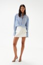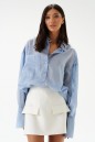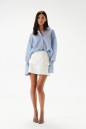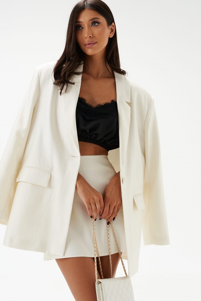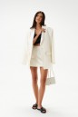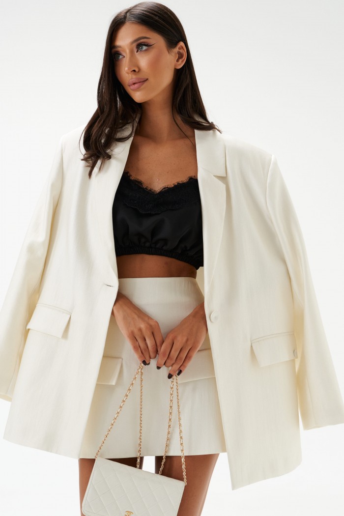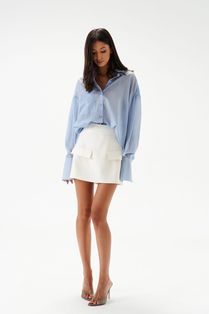 Юбка-мини. Выполнена из текстильного полотна в жемчужном цвете. Силуэт - трапеция, стабильный пояс, есть подкладка. Застежка - молния в шве заднего полотна изделия. Длина 38 см