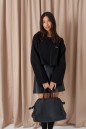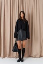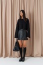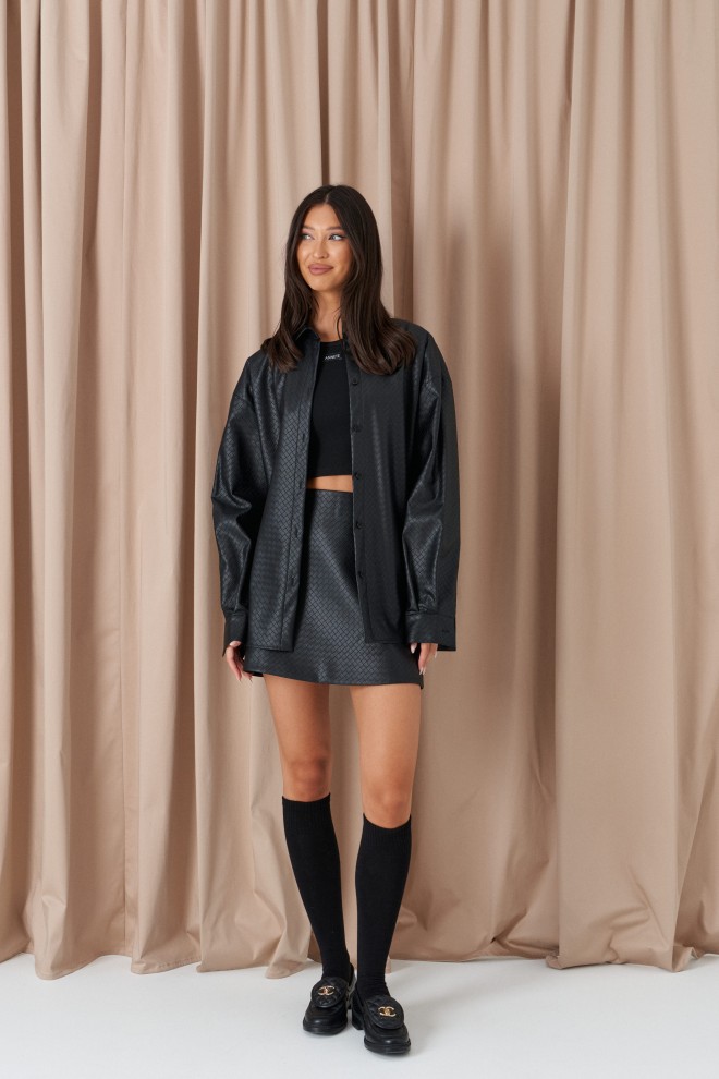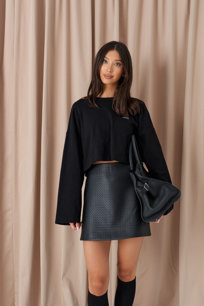 Юбка-трапеция. Выполнена из фактурной эко-кожи чёрного цвета. С подкладкой. Застёжка потайная молния в среднем шве заднего полотна. Длина 40 см