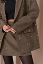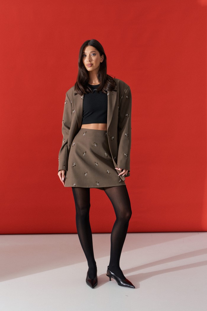 Юбка-мини прямого кроя. Выполнена из костюмной ткани цвета хаки с декоративной вышивкой. Силуэт - трапеция, стабильный пояс, на брендированной подкладке. Застежка - потайная молния в шве заднего полотна изделия. Длина 44см.