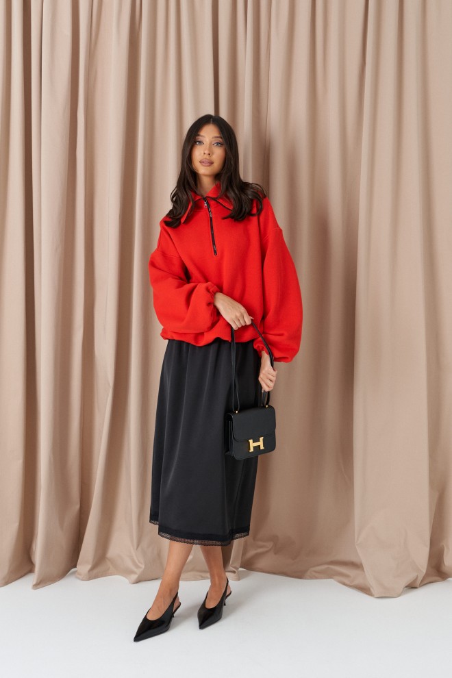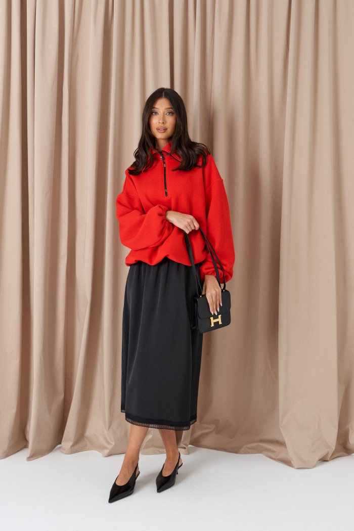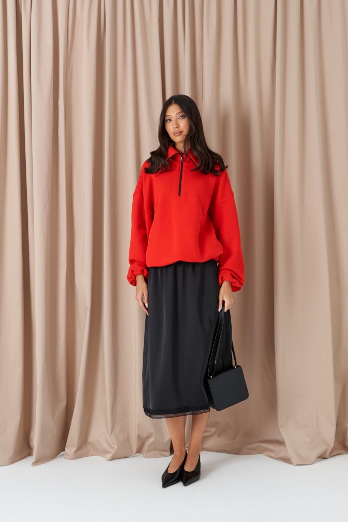 Юбка полуприлегающего силуэта выполнена из струящегося полотна черного цвета на брендированной подкладе. Характеристики: полуприлегающий силуэт, пояс на резинке, по низу изделия пришито кружево. Длина по боковому шву 78 см.