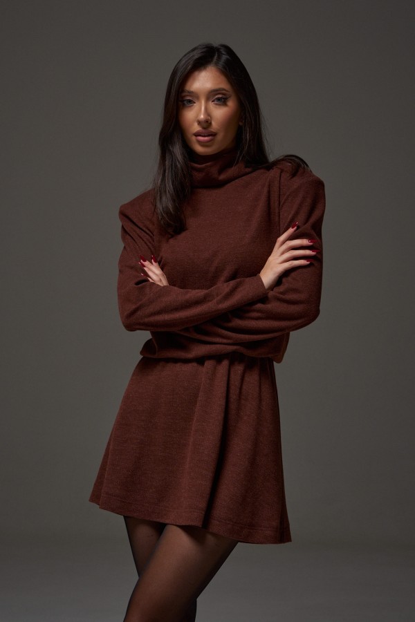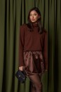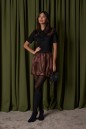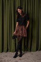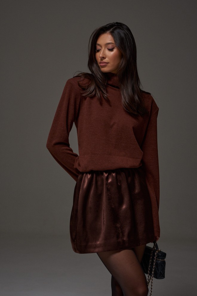 Юбка прямого кроя, выполнена из струящейся ткани коричневого цвета. Характеристики: прямой крой, на подкладке, пояс на резинке. Длина по боковому шву 42 см.