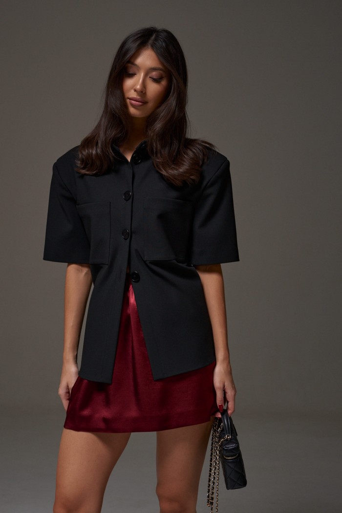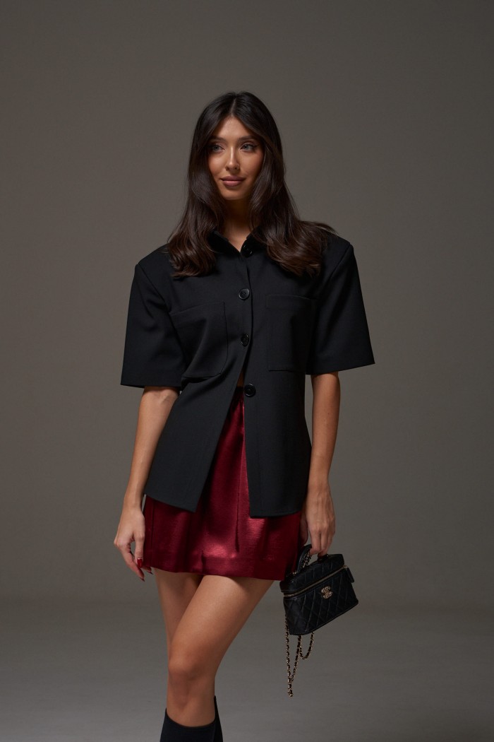 Юбка прямого кроя, выполнена из струящейся ткани бордового цвета. Характеристики: прямой крой, на подкладке, пояс на резинке. Длина по боковому шву 41 см.