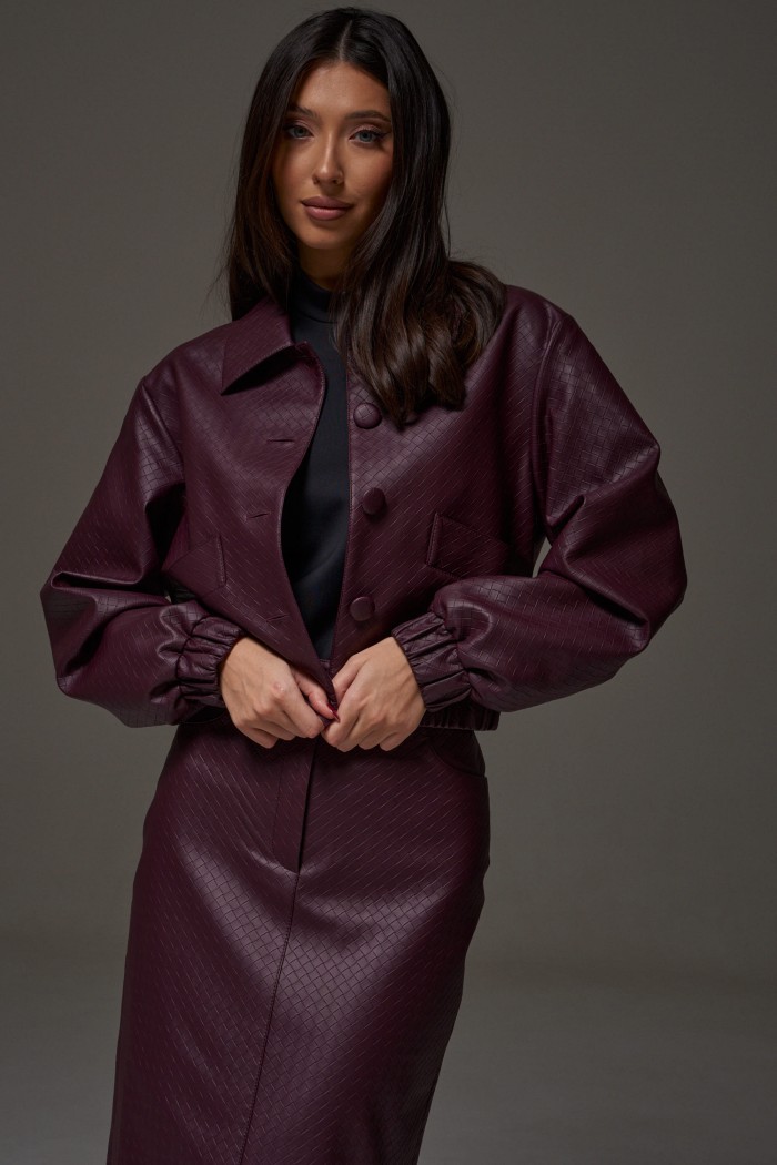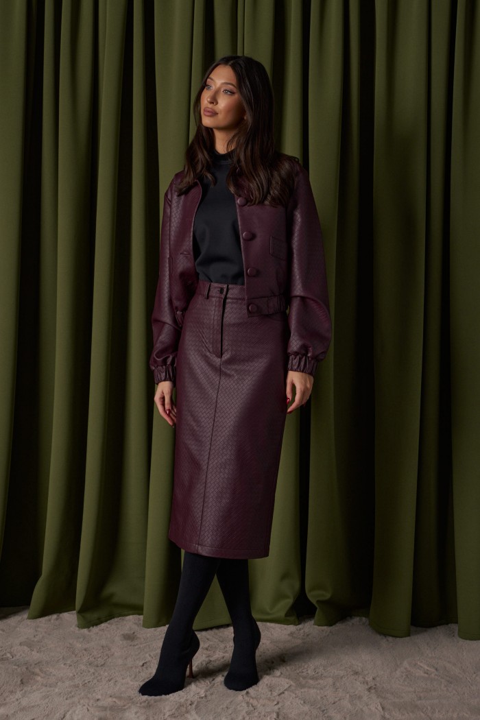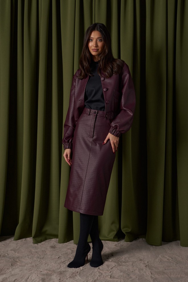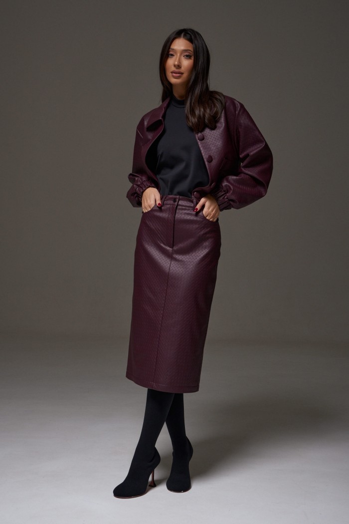 Юбка прямого кроя выполнена из фактурной эко-кожи бордового цвета. Характеристики: прямой крой, пояс стабильный со шлевками, на брендированной подкладке, застёжка центральная пуговица, молния, по передней части изделия прорезные карманы, по заднему полотну накладные карманы. Длина 75 см. В среднем шве разрез 32 см.