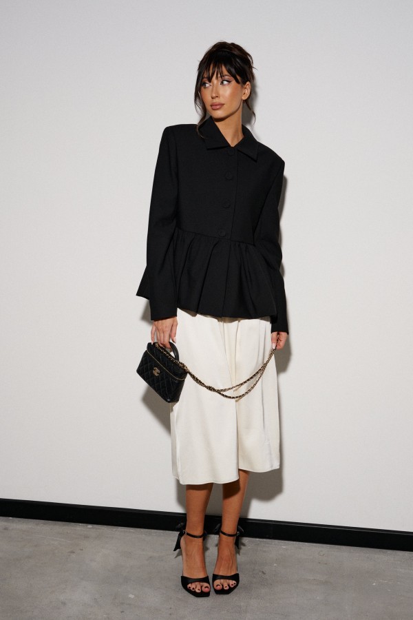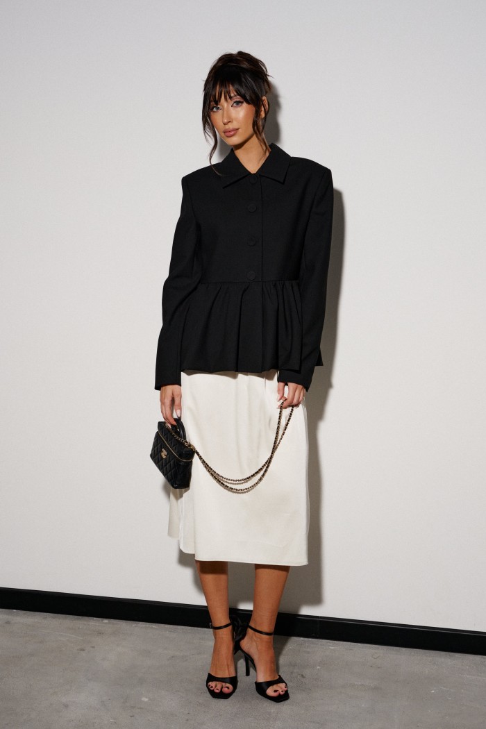 Юбка полуприлегающего силуэта выполнена из струящегося полотна молочного цвета на подкладке. Характеристики: полуприлегающий силуэт, пояс на резинке. Длина по боковому шву 77 см.