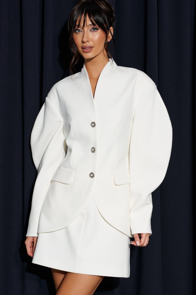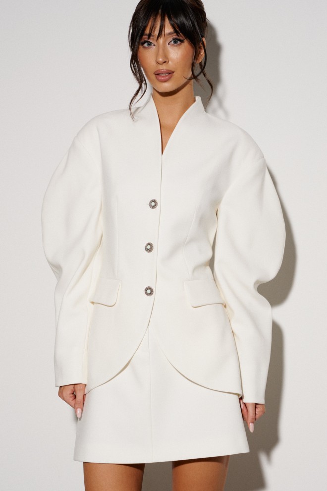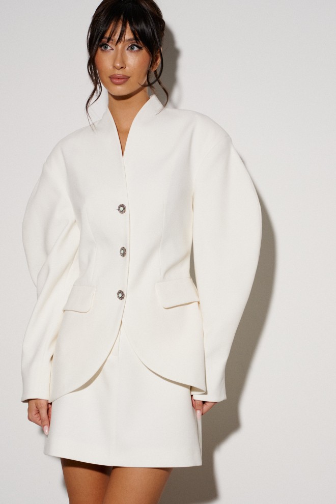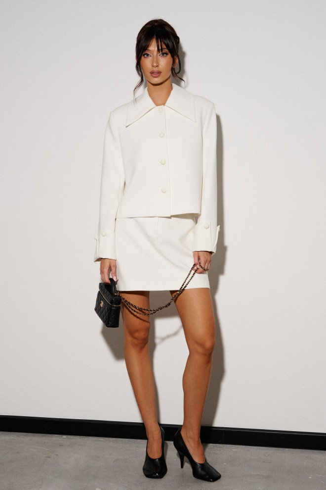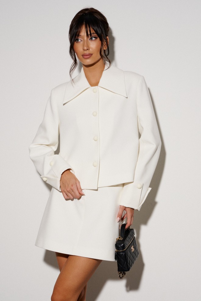 Юбка А-силуэта, выполнена из костюмной ткани белого цвета. Характеристики: пояс стабильный, застёжка центральная пуговица и потайная молния, по переду выточки, на подкладке. Длина изделия по боковому шву 43 см.