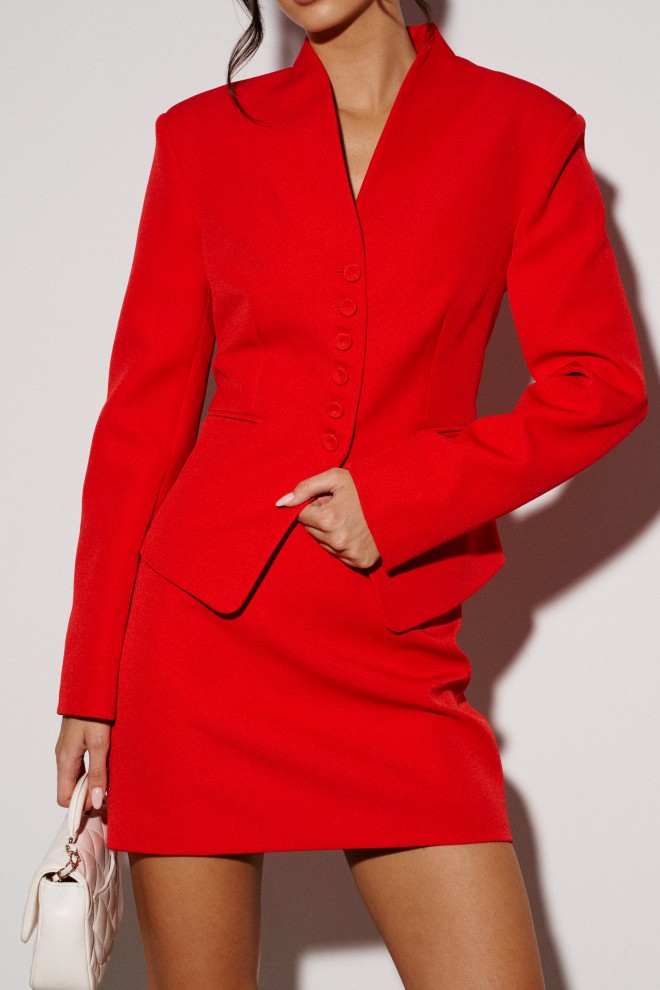 Юбка прямого кроя. Выполнена из костюмной ткани красного цвета. С подкладкой. Застежка - молния в среднем шве заднего полотна. Длина 42 см