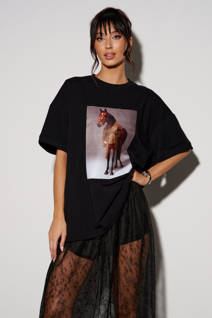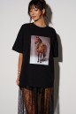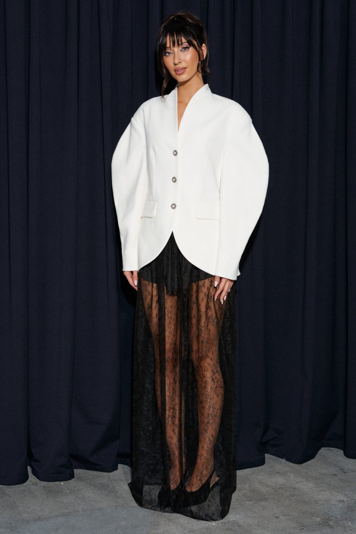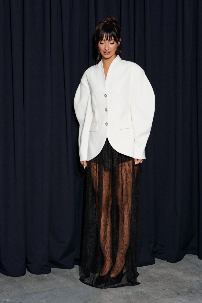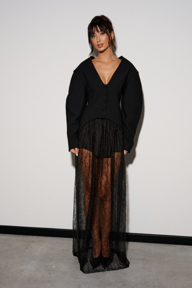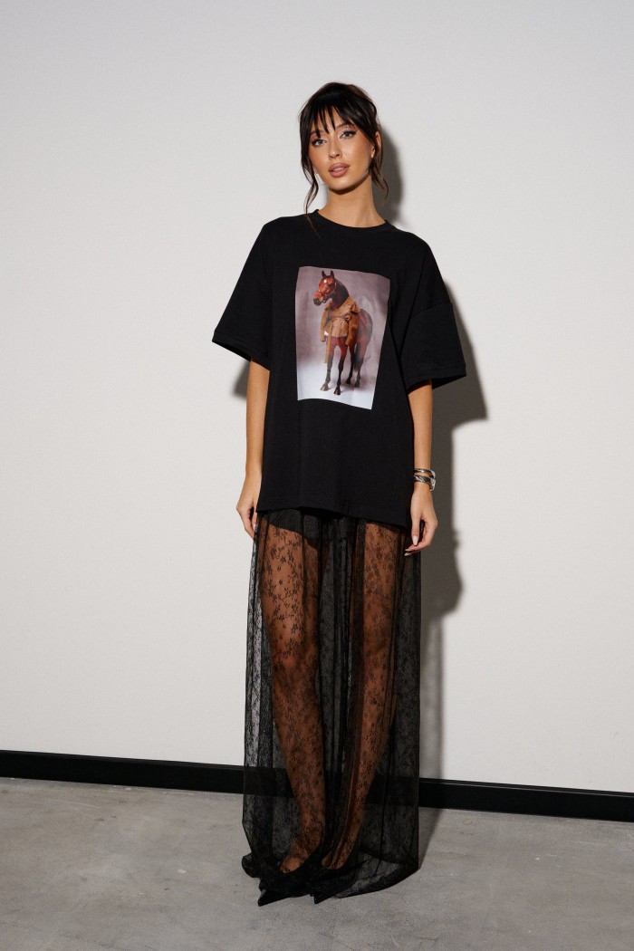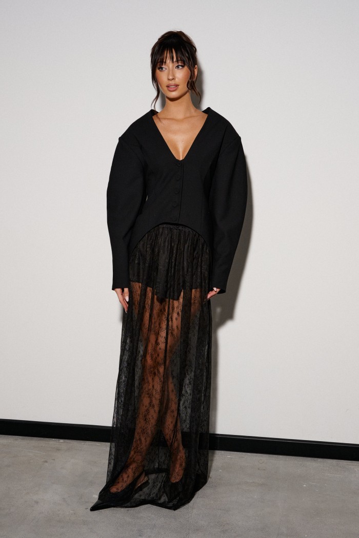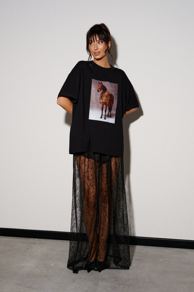 Юбка прямого кроя, выполнена из прозрачной ткани в сетку с декоративным узором.