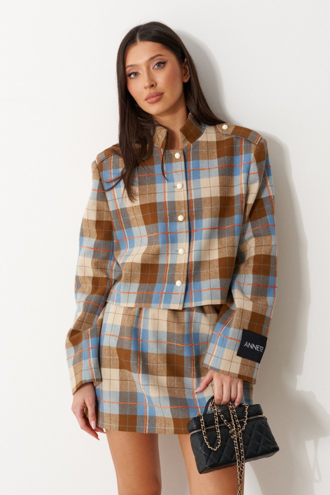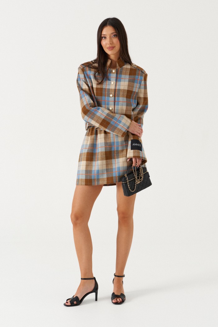 Юбка свободного кроя. Выполнена из костюмной ткани в клетку (цвета голубой, бежевый, коричневый). С подкладкой. Пояс на резинке. Застёжки в изделии нет. Длина бокового шва 41 см
